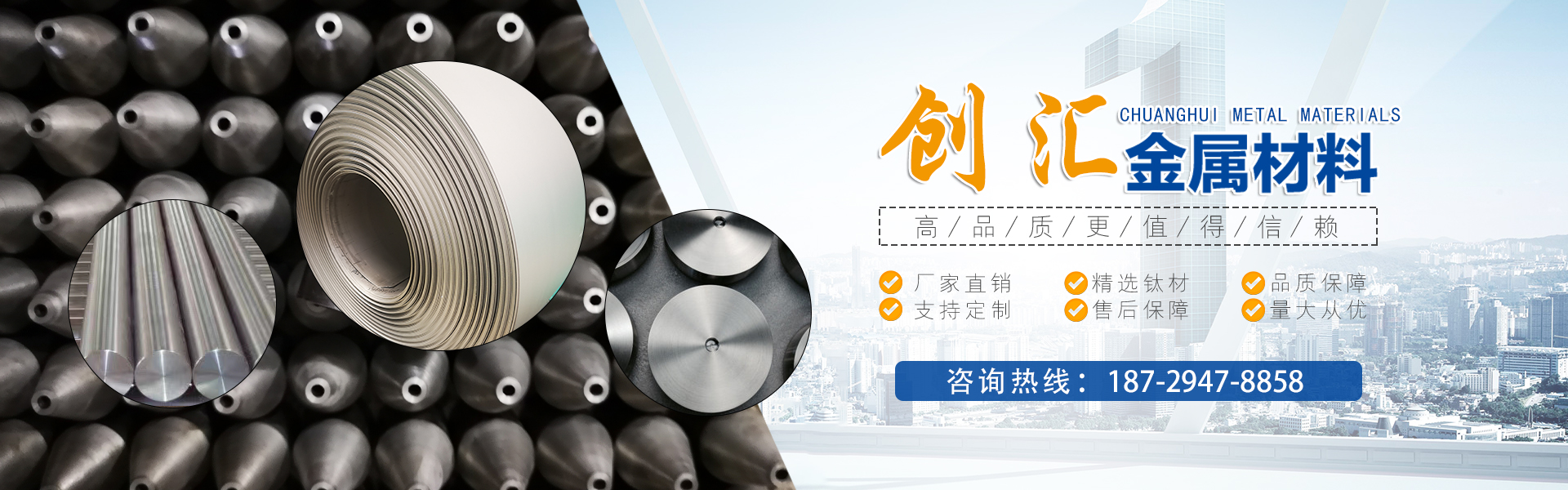 寶雞市創(chuàng)匯金屬材料有限公司,位于有“中國(guó)鈦谷”之稱(chēng)寶雞寶鈦路南段,這里也是國(guó)家重點(diǎn)支持和扶持的有色金屬材料資源產(chǎn)業(yè)基地,我司專(zhuān)業(yè)從事鈦、鋯、鉿、鎳鉻、鎢鉬、鉭鈮、合金材料、復(fù)合材料,板、棒、絲、管、箔材等,設(shè)備制造,金屬制品機(jī)械加工銷(xiāo)售。